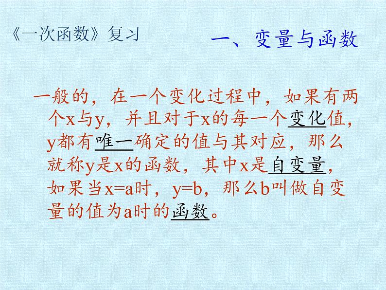 一般的,在一个变化过程中,如果有两个x与y,并且对于x的每一个变化值,y都有唯一确定的值与其对应,那么就称y是x的函数,其中x是自变量,如果当x=a时,y=b,那么b叫做自变量的值为a时的函数。