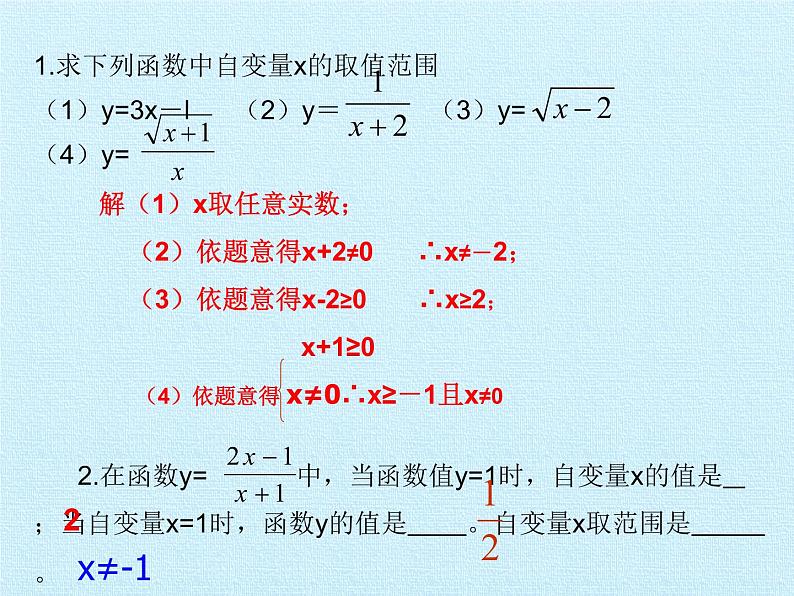 2.在函数y= 中,当函数值y=1时,自变量x的值是 ;当自变量x=1时,函数y的值是 。自变量x取范围是 。