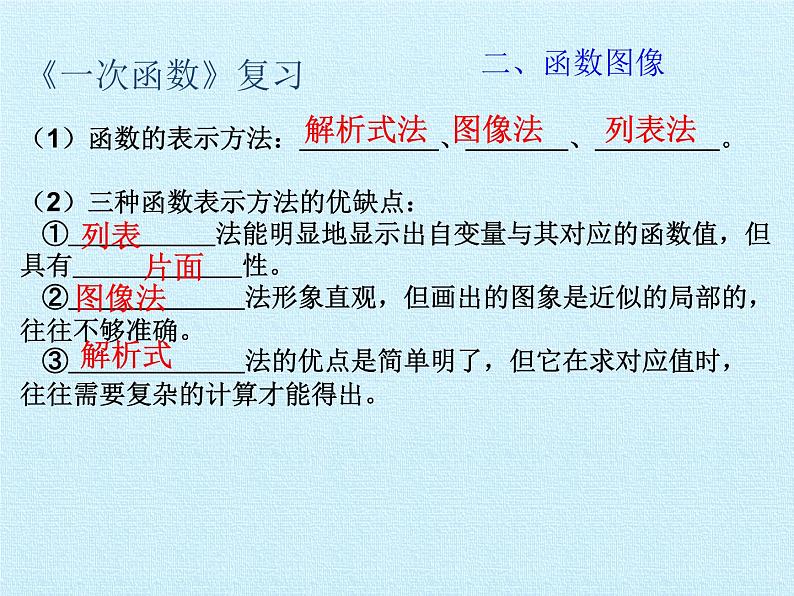 (1)函数的表示方法: 、 、 。(2)三种函数表示方法的优缺点: ① 法能明显地显示出自变量与其对应的函数值,但具有 性。 ② 法形象直观,但画出的图象是近似的局部的,往往不够准确。 ③ 法的优点是简单明了,但它在求对应值时,往往需要复杂的计算才能得出。