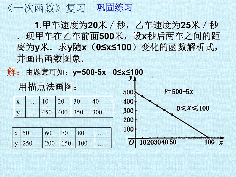 1.甲车速度为20米/秒,乙车速度为25米/秒.现甲车在乙车前面500米,设x秒后两车之间的距离为y米.求y随x(0≤x≤100)变化的函数解析式,并画出函数图象.