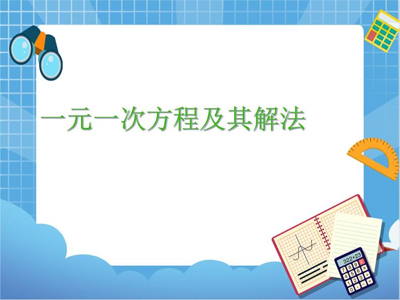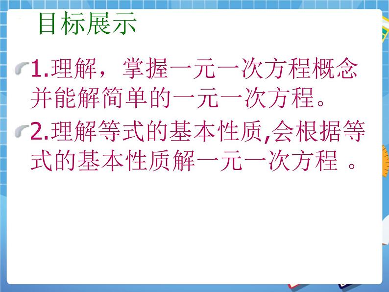 展开1.理解,掌握一元一次方程概念并能解简单的一元一次方程。2.理解等式的基本性质,会根据等式的基本性质解一元一次方程 。