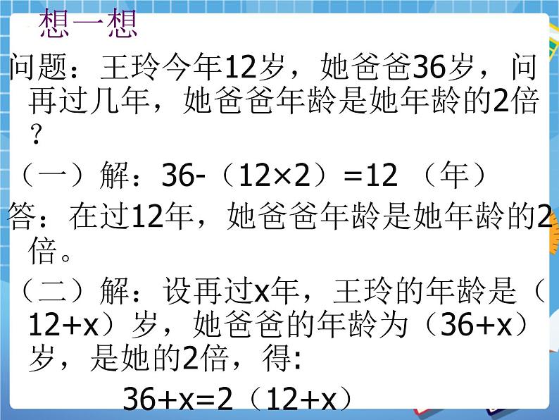 问题:王玲今年12岁,她爸爸36岁,问再过几年,她爸爸年龄是她年龄的2倍?(一)解:36-(12×2)=12 (年)答:在过12年,她爸爸年龄是她年龄的2 倍。(二)解:设再过x年,王玲的年龄是(12+x)岁,她爸爸的年龄为(36+x)岁,是她的2倍,得: 36+x=2(12+x)