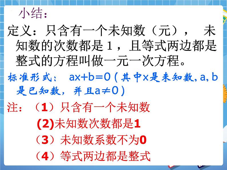 定义:只含有一个未知数(元), 未知数的次数都是1,且等式两边都是整式的方程叫做一元一次方程。标准形式: ax+b=0 ( 其中x是未知数, a, b是已知数,并且a≠0 )注:(1)只含有一个未知数 (2)未知数次数都是1 (3)未知数系数不为0 (4)等式两边都是整式