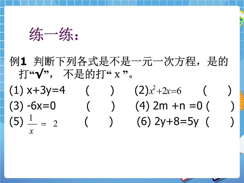 例1 判断下列各式是不是一元一次方程,是的打“√”, 不是的打“x”。(1) x+3y=4 ( ) (2) ( ) (3) -6x=0 ( ) (4) 2m +n =0 ( )(5) ( ) (6) 2y+8=5y ( )