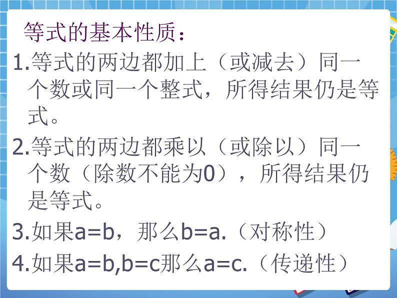 1.等式的两边都加上(或减去)同一个数或同一个整式,所得结果仍是等式。2.等式的两边都乘以(或除以)同一个数(除数不能为0),所得结果仍是等式。3.如果a=b,那么b=a.(对称性)4.如果a=b,b=c那么a=c.(传递性)
