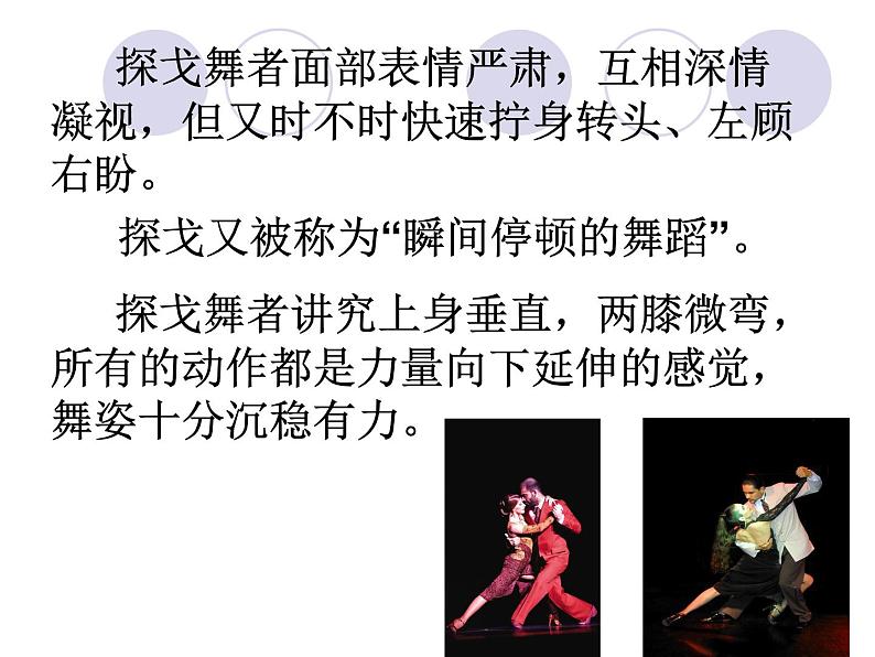 探戈舞者讲究上身垂直,两膝微弯,所有的动作都是力量向下延伸的感觉,舞姿十分沉稳有力。