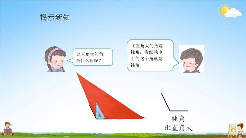 这是一份数学人教版3 角的初步认识教学课件ppt,共18页。PPT课件主要包含了认识锐角和钝角,学习目标,复习导入,比直角小,比直角大,锐角<直角<钝角,这是一个钝角,锐角和钝角的应用,找一找锐角和钝角,画锐角和钝角等内容,欢迎下载使用。