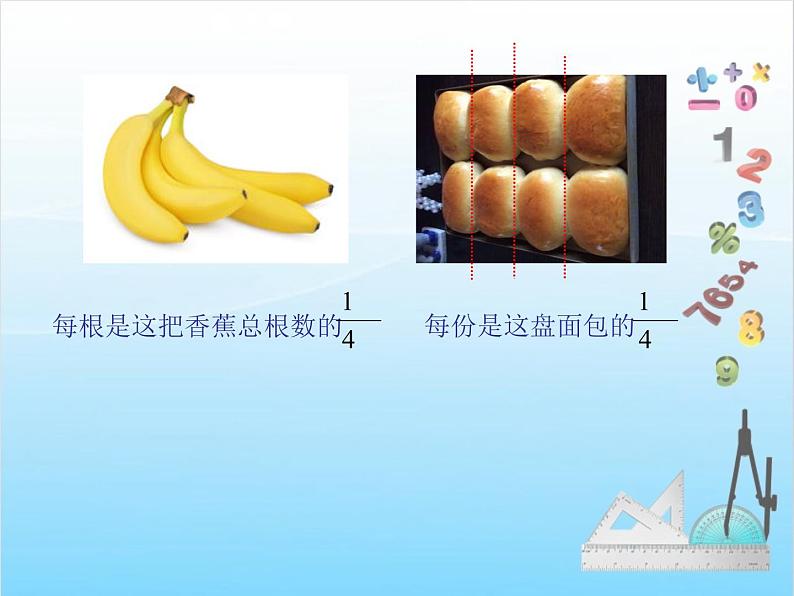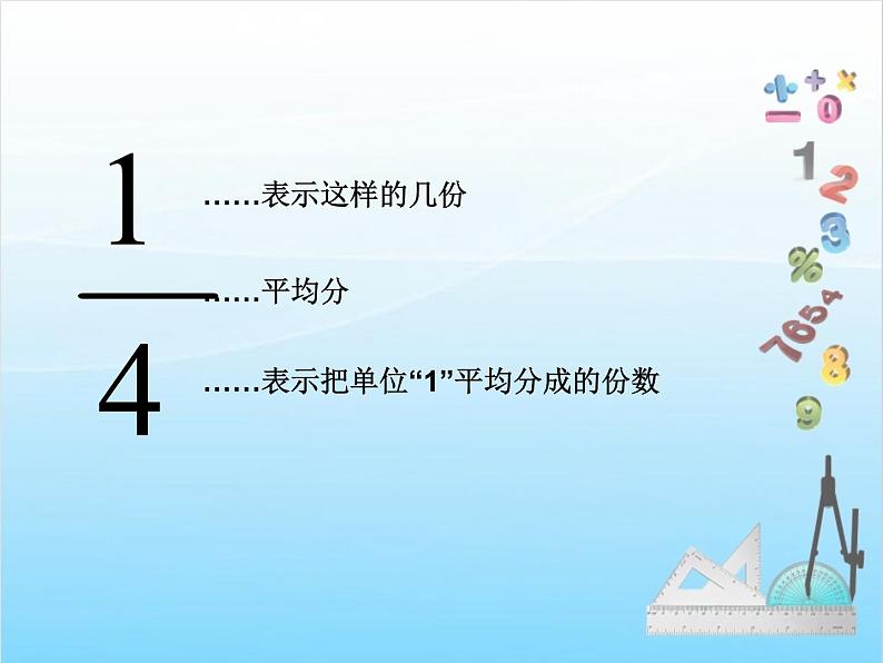 一个物体、一个计量单位和一些物体等都可以看作一个整体。把这个整体平均分成若干份,这样的一份或几份都可以用分数来表示。