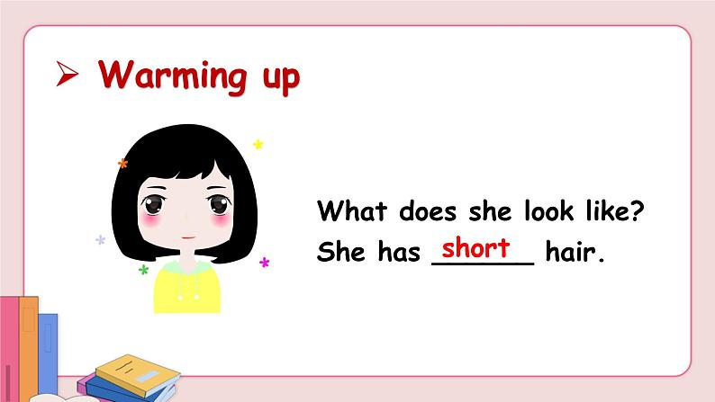 1) --What _____ she _____ like? -- She has ______ ______.2) -- _______des she lk like? -- She has ________ hair.