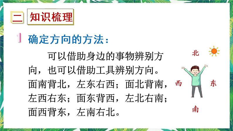 可以借助身边的事物辨别方向,也可以借助工具辨别方向。面南背北,左东右西;面北背南,左西右东;面东背西,左北右南;面西背东,左南右北。