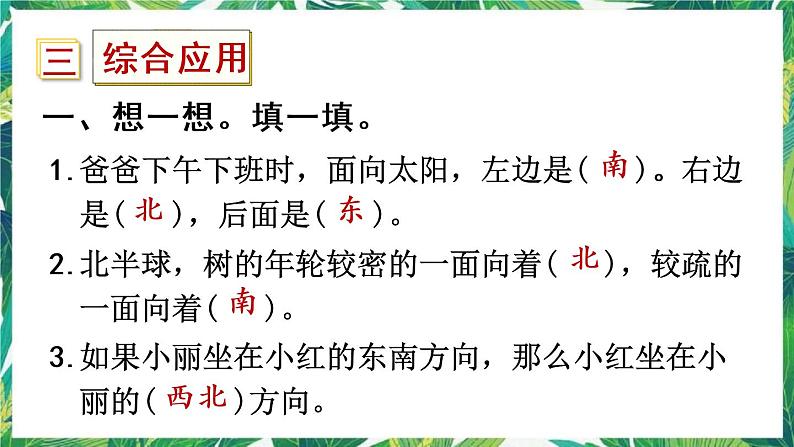 1.爸爸下午下班时,面向太阳,左边是( )。右边 是( ),后面是( )。