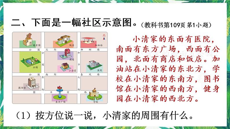 (1)按方位说一说,小清家的周围有什么。