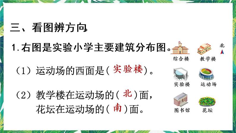 (3)综合楼在运动场的( )方 向,图书馆在运动场的( ) 方向。