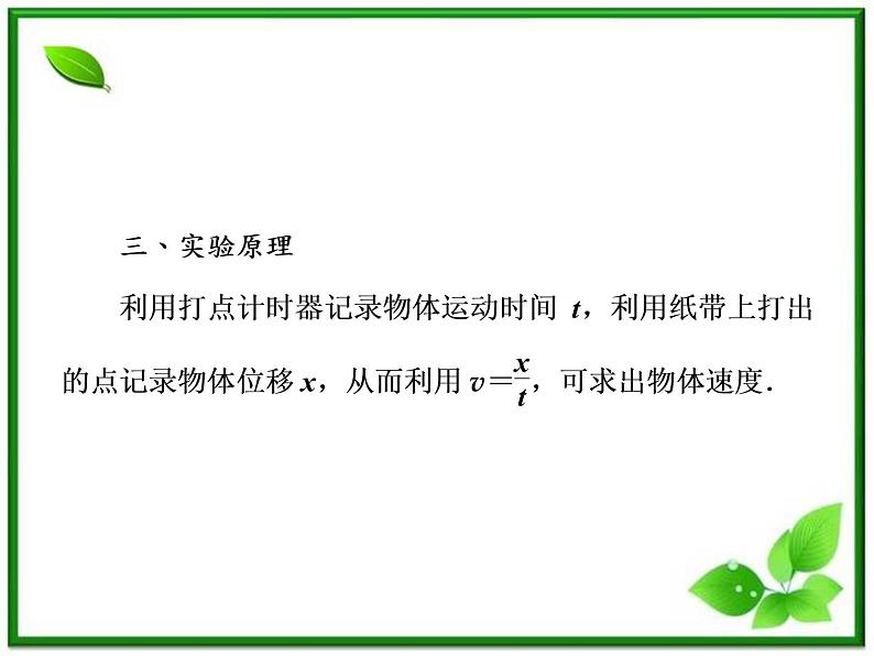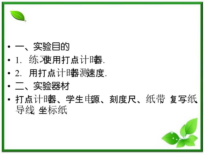 一、实验目的1.练习使用打点计时器.2.用打点计时器测速度.二、实验器材打点计时器、学生电源、刻度尺、纸带、复写纸、导线、坐标纸.