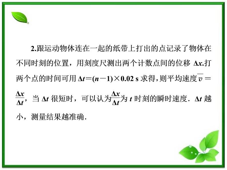 七、误差分析1.利用平均速度来代替计数点的瞬时速度自身带来系统误差.为减小误差,应取以计数点为中心的较短时间内的位移Δx来求平均速度.2.刻度尺读数存在偶然误差.3.作vt图时的偶然误差.