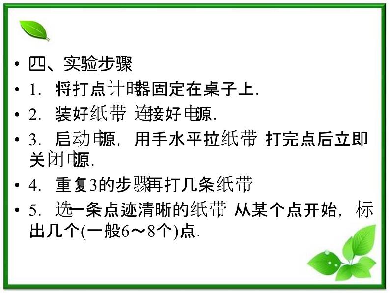 四、实验步骤1.将打点计时器固定在桌子上.2.装好纸带,连接好电源.3.启动电源,用手水平拉纸带,打完点后立即关闭电源.4.重复3的步骤再打几条纸带.5.选一条点迹清晰的纸带,从某个点开始,标出几个(一般6~8个)点.