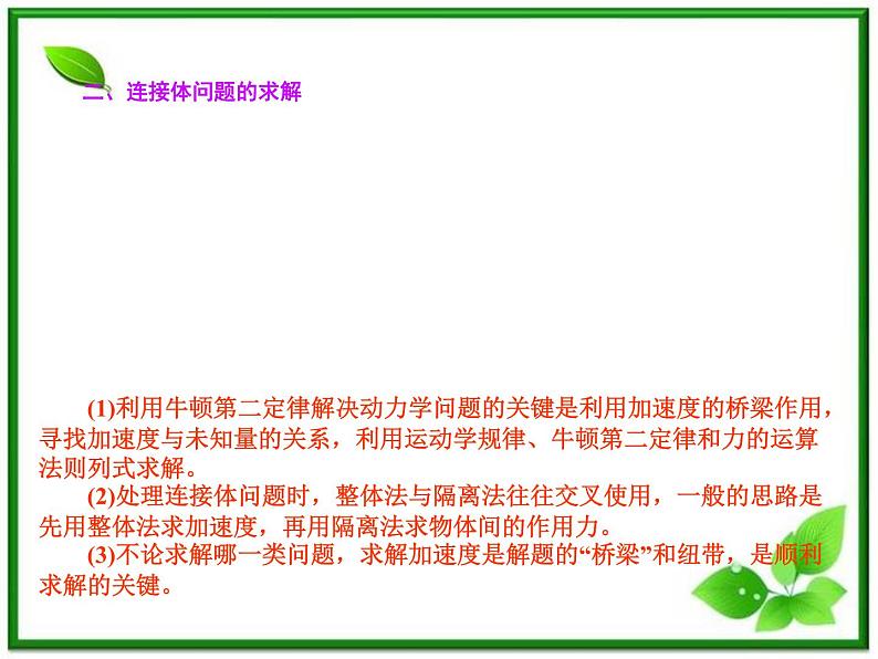 二、连接体问题的求解 利用牛顿第二定律处理连接体问题时常用的方法是整体法和隔离法。 (1)整体法:当系统中各物体的加速度相同时,我们可以把系统内的所有物体看成一个整体,这个整体的质量等于各物体的质量之和,当整体受到的外力已知时,可用牛顿第二定律求出整体的加速度,这种处理问题的思维方法叫整体法。 (2)隔离法:从研究的方便出发,当求系统内物体间相互作用时,常把物体从系统中“隔离”出来,进行分析,依据牛顿第二定律列方程,这种处理连接体问题的思维方法叫隔离法。