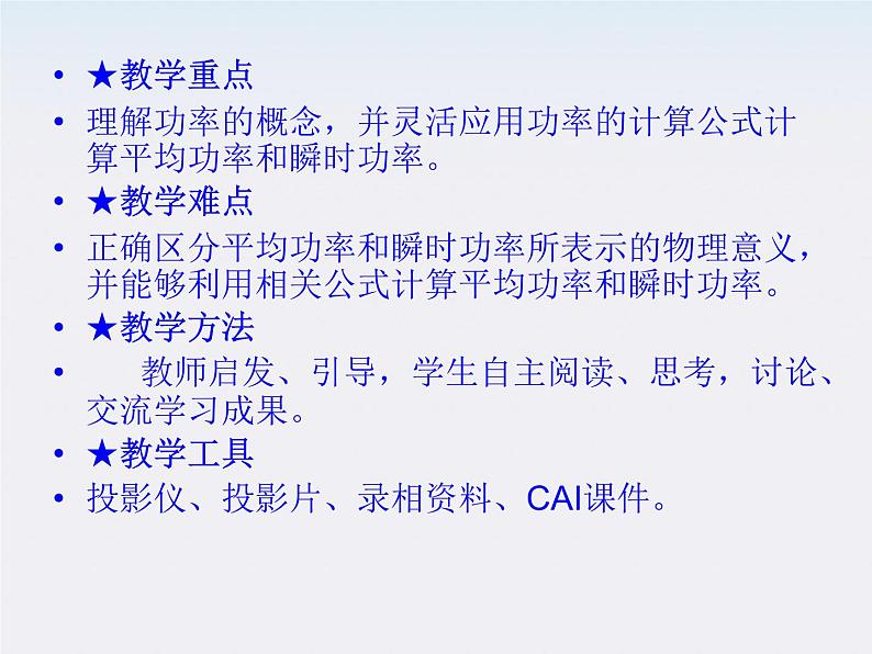 ★教学重点理解功率的概念,并灵活应用功率的计算公式计算平均功率和瞬时功率。★教学难点正确区分平均功率和瞬时功率所表示的物理意义,并能够利用相关公式计算平均功率和瞬时功率。★教学方法教师启发、引导,学生自主阅读、思考,讨论、交流学习成果。★教学工具投影仪、投影片、录相资料、CAI课件。