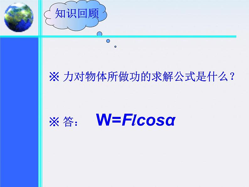 知识回顾 ※ 力对物体所做功的求解公式是什么?※ 答: W=Flcsα