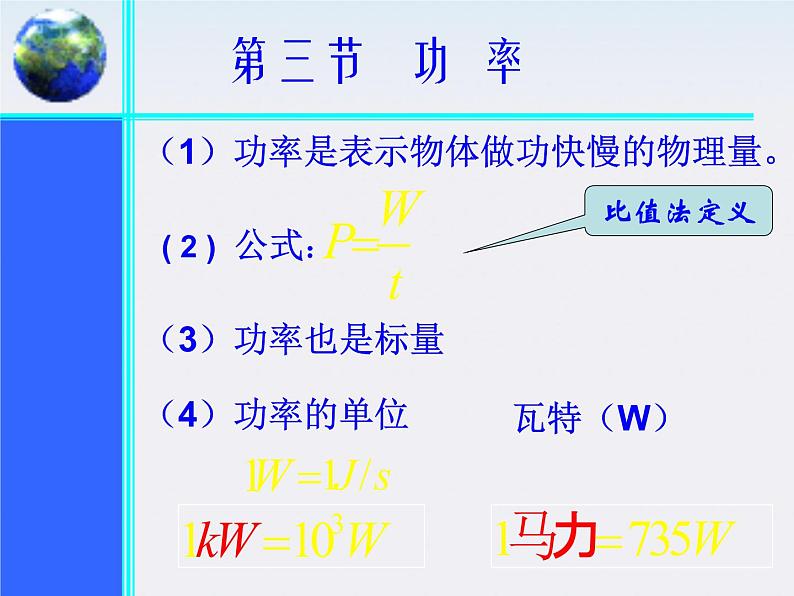 功率是表示物体做功快慢的物理量。一组概念辨析:平均功率、瞬时功率、额定功率、实际功率、机械效率等。