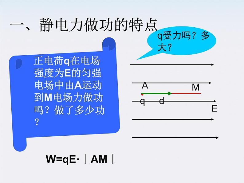 正电荷q在电场强度为E的匀强电场中由A运动到M电场力做功吗?做了多少功?