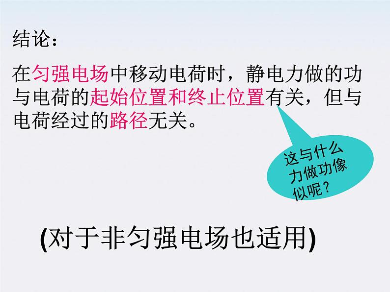 结论:在匀强电场中移动电荷时,静电力做的功与电荷的起始位置和终止位置有关,但与电荷经过的路径无关。