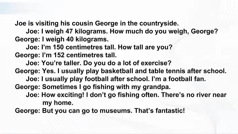 Je is visiting his cusin Gerge in the cuntryside. Je: I weigh 47 kilgrams. Hw much d yu weigh, Gerge?Gerge: I weigh 40 kilgrams. Je: I’m 150 centimetres tall. Hw tall are yu?Gerge: I’m 152 centimetres tall. Je: Yu’re taller. D yu d a lt f exercise?Gerge: Yes. I usually play basketball and table tennis after schl. Je: I usually play ftball after schl. I’m a ftball fan.Gerge: Smetimes I g fishing with my grandpa. Je: Hw exciting! I dn’t g fishing ften. There’s n river near my hme.Gerge: But yu can g t museums. That’s fantastic!