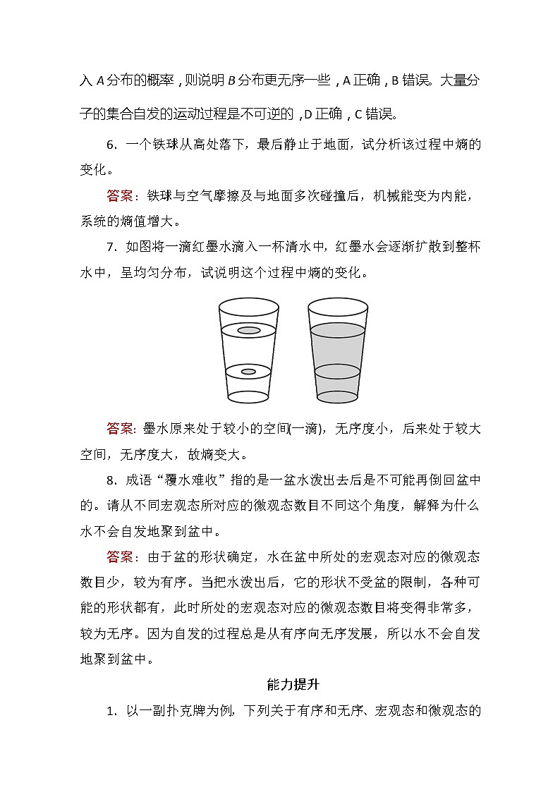 答案:由于盆的形状确定,水在盆中所处的宏观态对应的微观态数目少,较为有序。当把水泼出后,它的形状不受盆的限制,各种可能的形状都有,此时所处的宏观态对应的微观态数目将变得非常多,较为无序。因为自发的过程总是从有序向无序发展,所以水不会自发地聚到盆中。