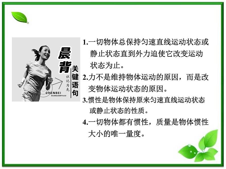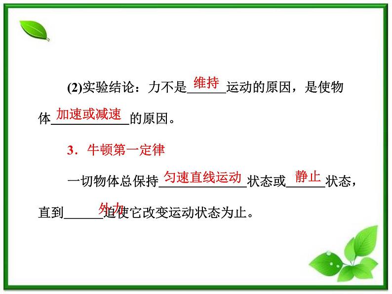 1.一切物体总保持匀速直线运动状态或 静止状态直到外力迫使它改变运动 状态为止。2.力不是维持物体运动的原因,而是改 变物体运动状态的原因。3.惯性是物体保持原来匀速直线运动状态 或静止状态的性质。4.一切物体都有惯性,质量是物体惯性 大小的唯一量度。