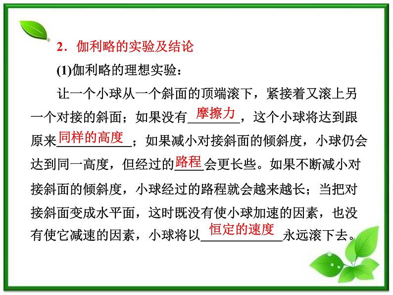 2.伽利略的实验及结论 (1)伽利略的理想实验: 让一个小球从一个斜面的顶端滚下,紧接着又滚上另一个对接的斜面;如果没有 ,这个小球将达到跟原来 ;如果减小对接斜面的倾斜度,小球仍会达到同一高度,但经过的 会更长些。如果不断减小对接斜面的倾斜度,小球经过的路程就会越来越长;当把对接斜面变成水平面,这时既没有使小球加速的因素,也没有使它减速的因素,小球将以 永远滚下去。