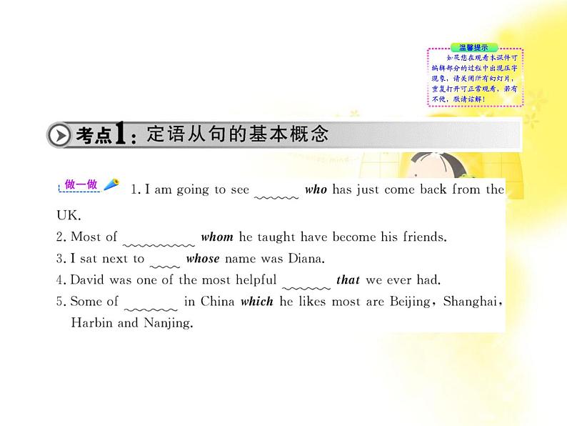4. Children eat much sugar ften get bad teeth. 【解析】在Children和eat中间加上关系词wh。5. This is wh everyne respects. 【解析】wh引导的定语从句前无先行词,故应在wh前加上the persn/man等名词。6. Thse wh has finished may leave the classrm nw. 【解析】has→have, 因为wh指代的thse是复数。