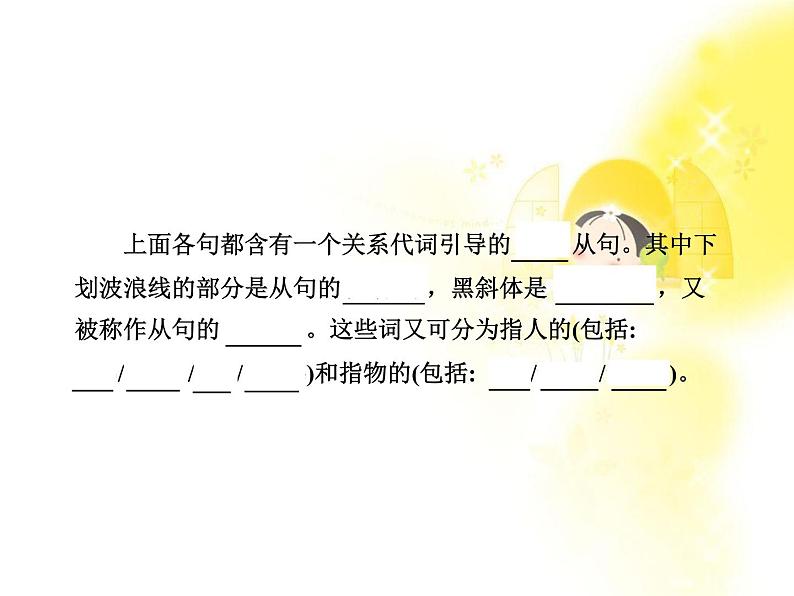 上面各句都含有一个关系代词引导的 定语 从句。其中下划波浪线的部分是从句的 先行词 ,黑斜体是 关系代词 ,又被称作从句的 引导词 。这些词又可分为指人的(包括: wh/whm/that/whse)和指物的(包括: that/which/whse)。