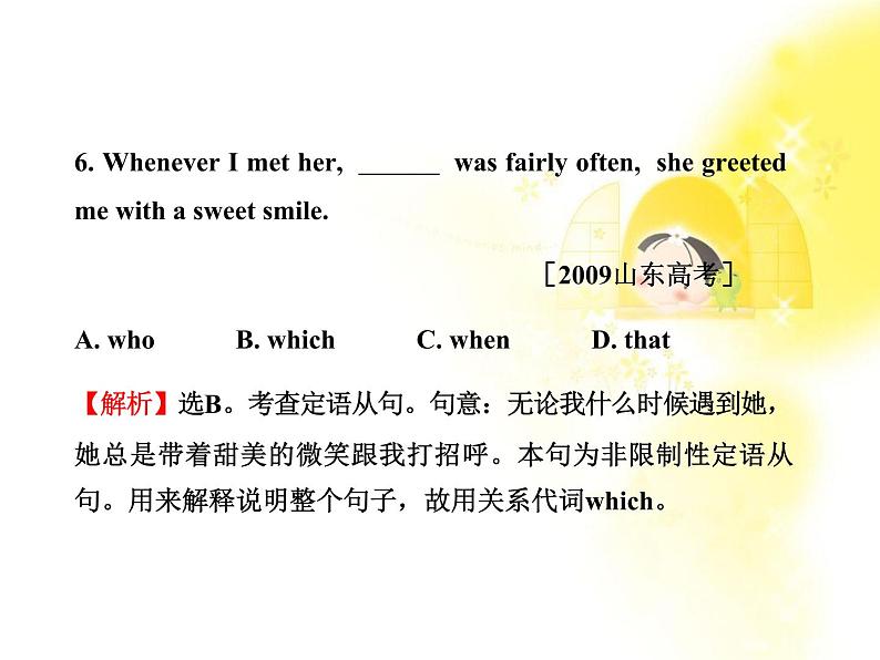 6. Whenever I met her, ______ was fairly ften, she greeted me with a sweet smile. [2009山东高考]A. wh B. which C. when D. that【解析】选B。考查定语从句。句意:无论我什么时候遇到她,她总是带着甜美的微笑跟我打招呼。本句为非限制性定语从句。用来解释说明整个句子,故用关系代词which。