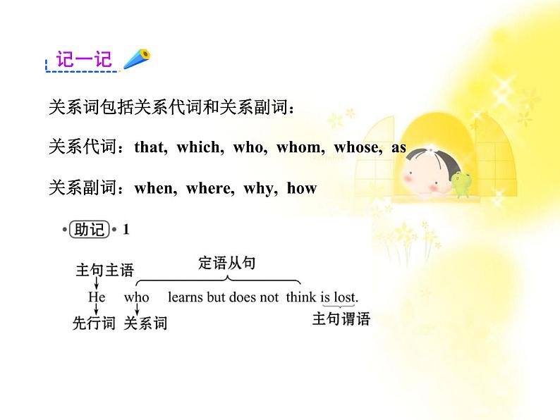 关系词包括关系代词和关系副词:关系代词:that, which, wh, whm, whse, as关系副词:when, where, why, hw