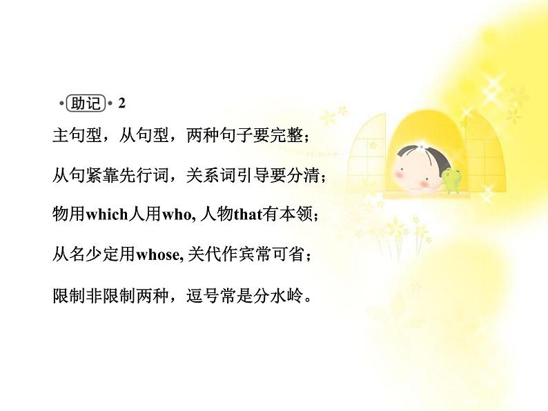 主句型,从句型,两种句子要完整;从句紧靠先行词,关系词引导要分清;物用which人用wh, 人物that有本领;从名少定用whse, 关代作宾常可省;限制非限制两种,逗号常是分水岭。