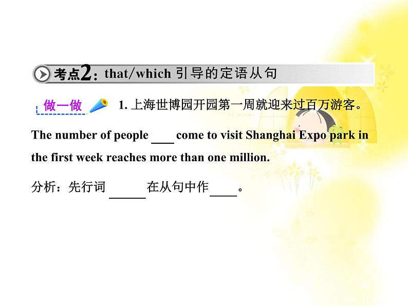 1. 上海世博园开园第一周就迎来过百万游客。The number f peple that cme t visit Shanghai Exp park in the first week reaches mre than ne millin. 分析:先行词 peple 在从句中作主语 。