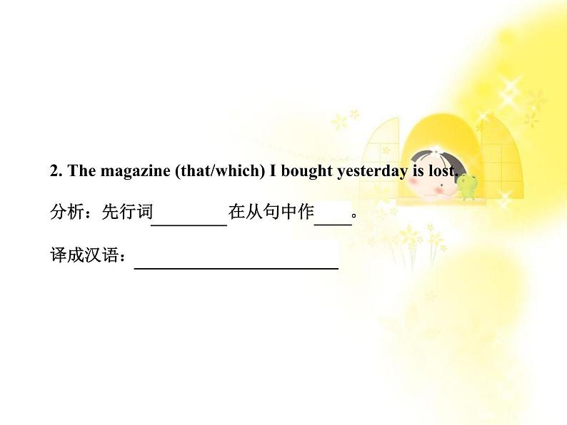 2. The magazine (that/which) I bught yesterday is lst. 分析:先行词magazine 在从句中作宾语。译成汉语:昨天我买的那本杂志丢了。