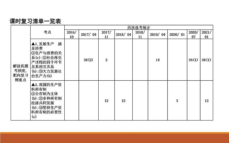 这是一份2022届高考政治一轮复习人教版必修一经济生活第四课生产与生产资料所有制课件,共43页。PPT课件主要包含了课时复习清单一览表,质量和水平,创造动力,新的劳动力,分配和交换,生产与消费,生产和消费,最终目的和动力,基础性,提高劳动者的素质等内容,欢迎下载使用。