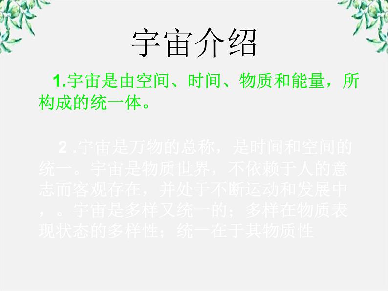 2 .宇宙是万物的总称,是时间和空间的统一。宇宙是物质世界,不依赖于人的意志而客观存在,并处于不断运动和发展中,。宇宙是多样又统一的;多样在物质表现状态的多样性;统一在于其物质性