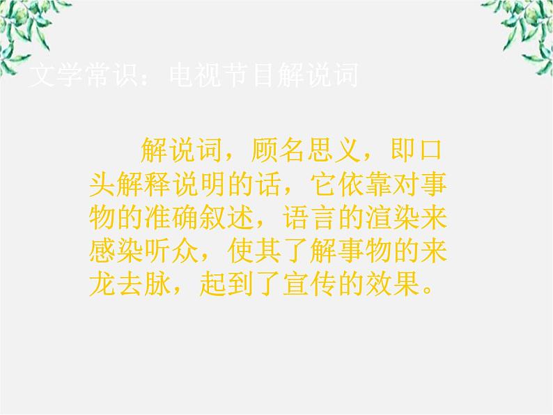 解说词,顾名思义,即口头解释说明的话,它依靠对事物的准确叙述,语言的渲染来感染听众,使其了解事物的来龙去脉,起到了宣传的效果。