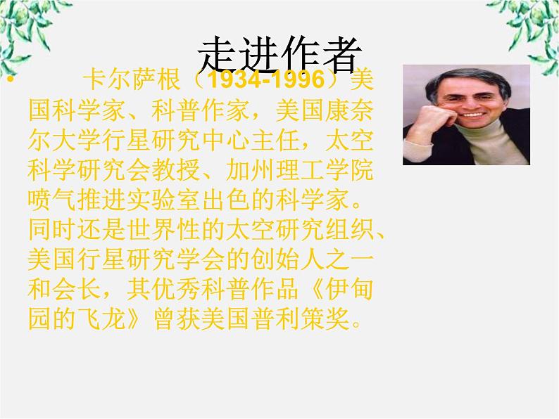 卡尔萨根(1934-1996)美国科学家、科普作家,美国康奈尔大学行星研究中心主任,太空科学研究会教授、加州理工学院喷气推进实验室出色的科学家。同时还是世界性的太空研究组织、美国行星研究学会的创始人之一和会长,其优秀科普作品《伊甸园的飞龙》曾获美国普利策奖。