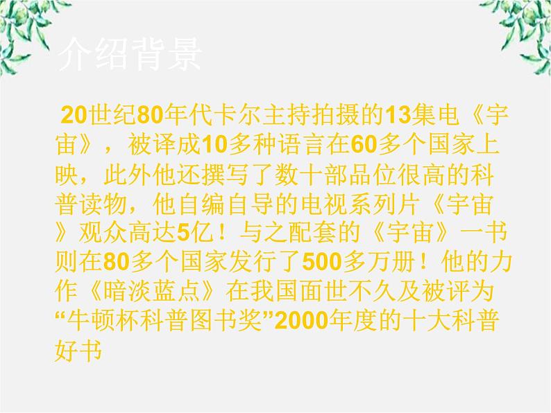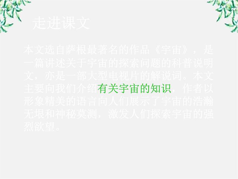 本文选自萨根最著名的作品《宇宙》,是一篇讲述关于宇宙的探索问题的科普说明文,亦是一部大型电视片的解说词。本文主要向我们介绍有关宇宙的知识,作者以形象精美的语言向人们展示了宇宙的浩瀚无垠和神秘莫测,激发人们探索宇宙的强烈欲望。