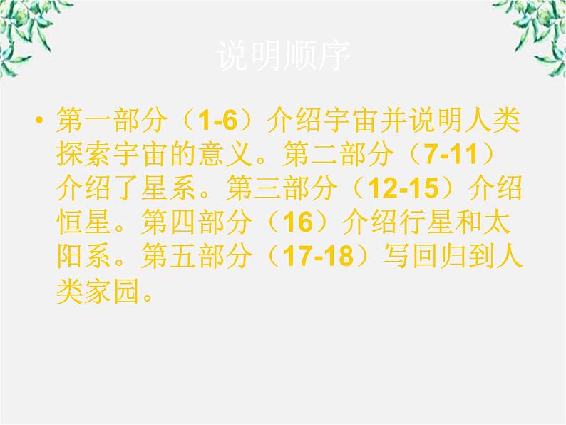 段解:第一部分(第1-3段),人类探索宇宙的原因及方法。层解:第一层(第4、5)段,地球的表面是宇宙汪洋之滨。 第二层(第6-14段),探索星系和恒星的奥秘。 第三层(第15-16段),探索彗星和行星的奥秘。段解:第二部分(4-16段)探索宇宙的奥秘。 第三部分(第17、18段)人类从地球开始探索与宇宙的奥秘。