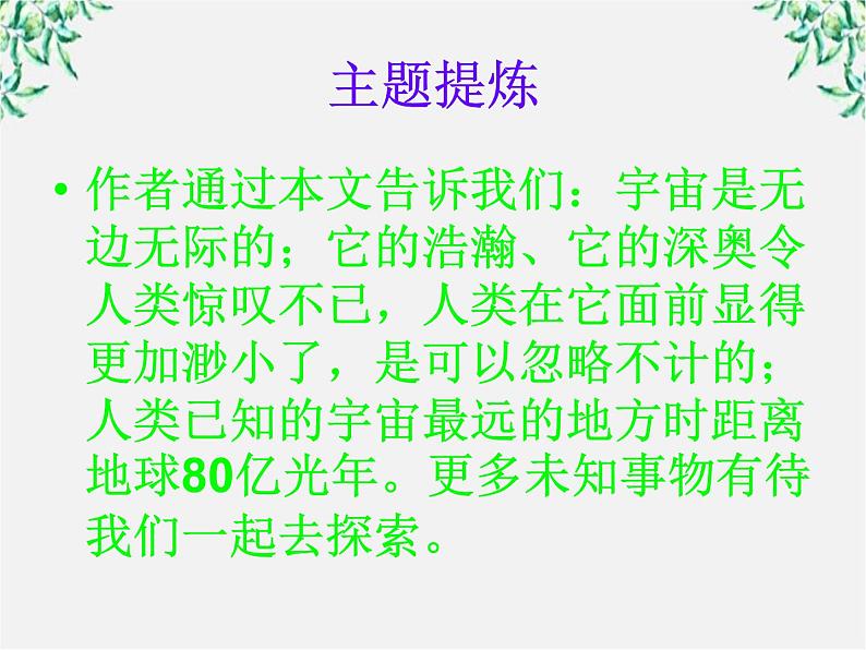(3)笔带激情 文章的语言是充满感情的,是有文学色彩的。如“只要一想起宇宙······如同回忆起许久以前的一次悬崖失足那样令人晕眩战栗”,用“晕眩战栗”来形容人们面对宇宙众多奥秘时那种激动的心情。