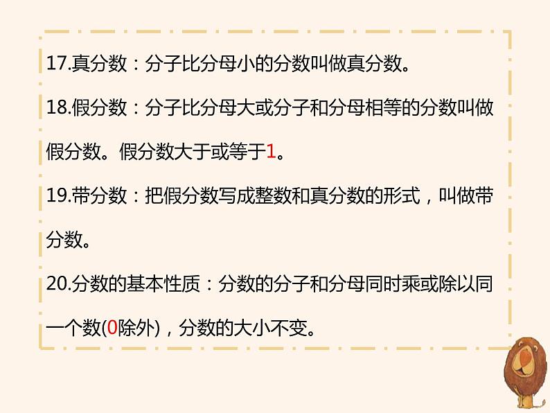 定义、定理公式1.加法交换律:两数相加交换加数的位置,和不变。a + b = b + a2.加法结合律:三个数相加,先把前两个数相加,或先把后两个数相加,再同第三个数相加,和不变。(a + b) + c = a + (b + c)3.乘法交换律:两数相乘,交换因数的位置,积不变。a × b = b × a4.乘法结合律:三个数相乘,先把前两个数相乘,或先把后两个数相乘,再和第三个数相乘,它们的积不变。(a × b) × c = a × (b × c)5.乘法分配律:两个数的和同一个数相乘,可以把两个加数分别同这个数相乘,再把两个积相加,结果不变。(a + b) × c = a × c + b × c6.减法的运算性质:a -b- c =a-(b + c)7.除法的运算定律:a ÷ b ÷ c =a ÷(b × c)8.除法的性质:在除法里,被除数和除数同时扩大(或缩小)相同的倍数(0除外),商不变。0除以任何不是0的数都得0。9.等式:等号左边的数值与等号右边的数值相等的式子叫做等式。等式的基本性质:等式两边同时乘(或除以)一个相同的数,等式仍然成立。10.方程:含有未知数的等式叫方程。11.分数:把单位“1”平均分成若干份,表示这样的一份或几份的数,叫做分数。12.分数的加、减法法则:同分母的分数相加减,只把分子相加减,分母不变。异分母的分数相加减,先通分,然后再相加减。13.分数大小的比较:同分母的分数相比较,分子大的大,分子小的小。异分母的分数相比较,先通分然后再比较;若分子相同,分母大的反而小。14.分数乘整数,用分数的分子和整数相乘的积作分子,分母不变。15.分数乘分数,用分子相乘的积作分子,分母相乘的积作为分母。16.除以一个数(0除外),等于分数乘这个数的倒数。17.真分数:分子比分母小的分数叫做真分数。18.假分数:分子比分母大或分子和分母相等的分数叫做假分数。假分数大于或等于1。19.带分数:把假分数写成整数和真分数的形式,叫做带分数。20.分数的基本性质:分数的分子和分母同时乘或除以同一个数(0除外),分数的大小不变。(4)正比例:两种相关联的量,一种量变化,另一种量也随着化,如果这两种量中相对应的的比值(也就是商k)一定,这两种量就叫做成正比例的量,它们的关系就叫做正比例关系。如: =k(k一定)或kx=y。(5)反比例:两种相关联的量,一种量变化,另一种量也随着变化,如果这两种量中相对应的两个数的积一定,这两种量就叫做成反比例的量,它们的关系就叫做反比例关系。如:x×y=k(k一定)或 =y。(6)百分数:表示一个数是另一个数的百分之几的数,叫做百分数。百分数也叫做百分率或百分比。23.小数、分数、百分数的互化(1)把小数化成百分数,只要把小数点向右移动两位,同时在后面添上百分号。其实,把小数化成百分数,只要把这个小数乘100%就行了。(2)把百分数化成小数,只要把百分号去掉,同时把小数点向左移动两位。(3)把分数化成百分数,通常先把分数化成小数(除不尽时,通常保留三位小数),再把小数化成百分数。其实,把分数化成百分数,要先把分数化成小数后,再乘100%就行了。(4)把百分数化成分数,先把百分数改写成分数,能约分的要约成最简分数。24.最大公约数:几个数都能被同一个数一次性整除,这个数就叫做这几个数的最大公约数。(或几个数公有的约数,叫做这几个数的公约数。其中最大的一个叫做最大公约数。)25.互质数:公约数只有1的两个数,叫做互质数。26.最小公倍数:几个数公有的倍数,叫做这几个数的公倍数,其中最小的一个叫做这几个数的最小公倍数。27.通分:把异分母分数的分别化成和原来分数相等的同分母的分数,叫做通分。(通分用最小公倍数)28.约分:把一个分数化成同它相等,但分子、分母都比较小的分数,叫做约分。(约分用最大公约数)29.最简分数:分子、分母是互质数的分数,叫做最简分数。(1)分数计算到最后,得数必须化成最简分数。(2)个位上是0、2、4、6、8的数,都能被2整除,即能用2进行约分。(3)个位上是0或者5的数,都能被5整除,即能用5进行约分。30.偶数和奇数:能被2整除的数叫做偶数。不能被2整除的数叫做奇数。31.质数(素数):一个数,如果只有1和它本身两个约数,这样的数叫做质数(或素数)。32.合数:一个数,如果除了1和它本身还有别的约数,这样的数叫做合数。1不是质数,也不是合数。33.代数式:用字母表示的式子叫做代数式。如:3x、a+b。34.利息=本金×利率×时间,时间一般以年或月为单位,应与利率的单位相对应。35.利率:利息与本金的比值叫做利率。一年的利息与本金的比值叫做年利率。一个月的利息与本金的比值叫做月利率。36.循环小数:一个小数,从小数部分的某一位起,一个数字或几个数字依次不断的重复出现,这样的小数叫做循环小数。如:3.14141437.不循环小数:一个小数,从小数部分起,没有一个数字或几个数字依次不断的重复出现,这样的小数叫做不循环小数。如: 3.14159265438.无限不循环小数:一个小数,从小数部分起到无限位数,没有一个数字或几个数字依次不断的重复出现,这样的小数叫做无限不循环小数。如: 3.141592654…