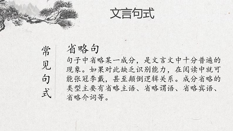 省略句句子中省略某一成分,是文言文中十分普遍的现象。如果对此缺乏识别能力,在阅读中就可能张冠李戴,甚至颠倒逻辑关系。成分省略的类型主要有省略主语、省略谓语、省略宾语、省略介词等。