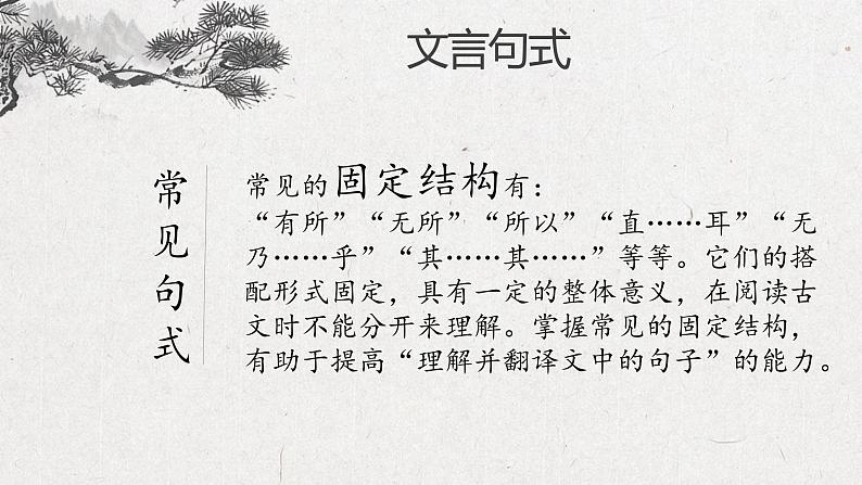 常见的固定结构有:“有所”“无所”“所以”“直……耳”“无乃……乎”“其……其……”等等。它们的搭配形式固定,具有一定的整体意义,在阅读古文时不能分开来理解。掌握常见的固定结构,有助于提高“理解并翻译文中的句子”的能力。