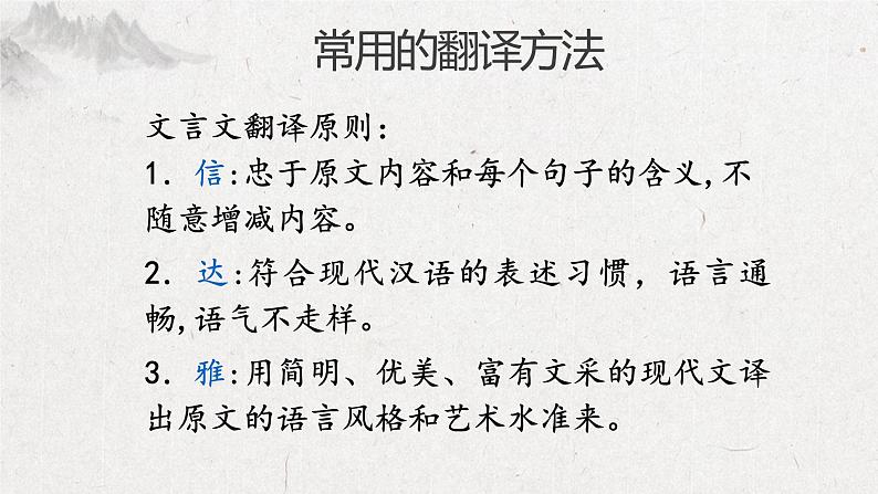 2024届高考语文复习:文言文备考之文言文翻译 课件: 这是一份2024届高考语文复习:文言文备考之文言文翻译 课件,共39页。PPT课件主要包含了文言文备考之,文言文翻译,考情分析,近三年该题考察情况,理解文言句意技法,文言翻译六字决,强化训练等内容,欢迎下载使用。