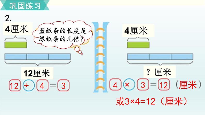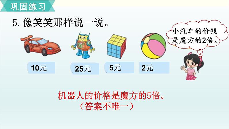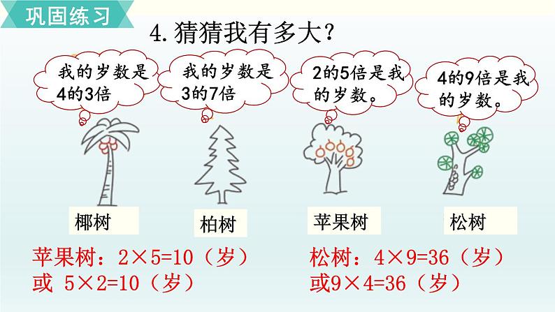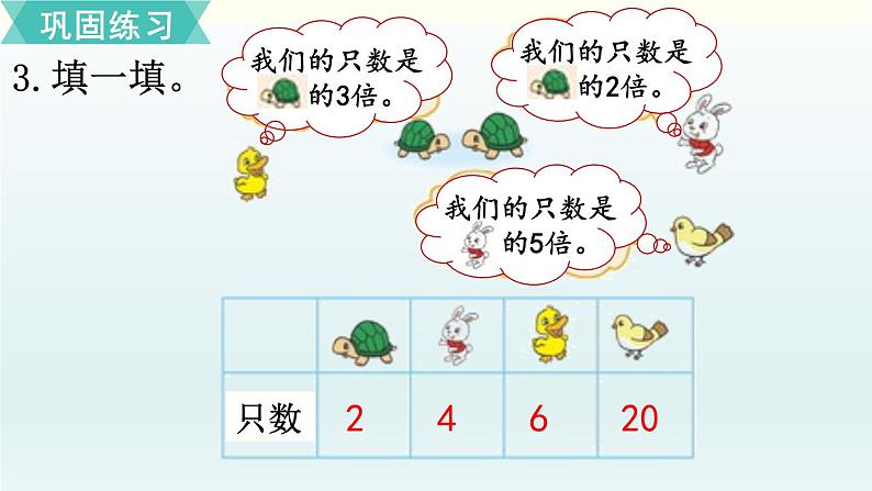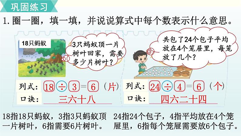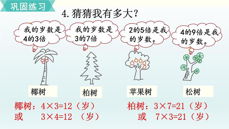 练习六义务教育北师大版二年级上册1.圈一圈,填一填,并说说算式中每个数表示什么意思。18÷36÷46个三六十八四六二十四片2418指18只蚂蚁,3指3只蚂蚁顶一片树叶,6指需要6片树叶。24指24个包子,4指平均放在4个笼屉里,6指每个笼屉需要放6个包子。18只蚂蚁列式:口诀:列式:口诀:2.434×312厘米12÷或3×4=12(厘米)4厘米4厘米?厘米12厘米3.填一填。26204只数4.猜猜我有多大?椰树:4×3=12(岁)或 3×4=12 (岁) 柏树:3×7=21(岁) 或 7×3=21(岁)苹果树:2×5=10(岁)或 5×2=10(岁)松树:4×9=36(岁)或9×4=36(岁)4.猜猜我有多大?5.像笑笑那样说一说。机器人的价格是魔方的5倍。 (答案不唯一)10元25元5元2元6.连一连。6÷34÷421÷38÷445÷925÷528÷415÷31752 4×6=24(元)或 6×4=24(元)答:需要24元。(1)买6副手套需要多少元?24÷3=8答:鞋的价钱是袜子的8倍。(2)鞋的价钱是袜子的几倍?(3)30元正好可以买什 么?请给出两种买法。第一种:可以买2双袜子,和1双鞋子;第二种:可以买2双袜子,和2顶帽子。 (答案不唯一)用买1顶帽子的钱可以买多少双袜子? 12÷3=4(双)答:用买1顶帽子的钱可以买4双袜子。 (所提问题不唯一)(4)请你再提出一个数学问 题,并尝试解答。12÷4=3 答:彩笔的支数是毛笔的3倍。 (1)彩笔的支数是毛笔的几倍? 4×5=20(支) 或 5×4=20(支)答:笔筒里有20支铅笔。 (2)笔筒里有多少支铅笔?4+12+20=36(支)答:这三种笔一共有36支。 (3)这三种笔一共有多少支?9.找一找生活中与“倍”有关的实际问题。妈妈的年龄是32岁,小优的年龄是8岁,妈妈的年龄是小优的几倍?32÷8=4答:妈妈的年龄是小优的4倍。(答案不唯一)10.掷一次骰子,朝上的面是几,就将棋子放在相应的位置,再根据要求移动棋子。与同伴一起玩,看看谁的步数少。提示:游戏开始时掷骰子,先根据掷出的点数摆放棋子,接着根据相应位置上的算式的结果移动棋子,先到“50”的位置者获胜。(都自己动手尝试一下吧)通过这节课的学习,你有什么收获?1.从课后习题中选取;2.完成练习册本课时的习题。 课后作业