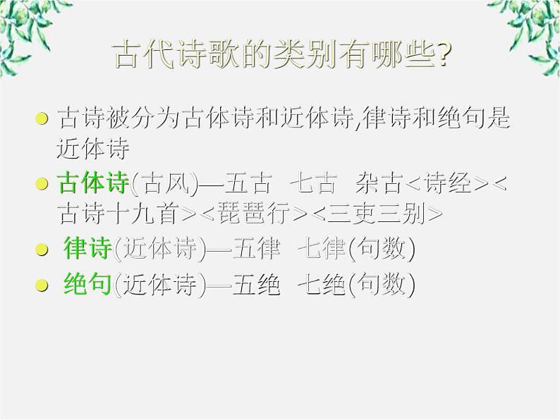 古诗被分为古体诗和近体诗,律诗和绝句是近体诗古体诗(古风)—五古 七古 杂古<诗经><古诗十九首><琵琶行><三吏三别> 律诗(近体诗)—五律 七律(句数) 绝句(近体诗)—五绝 七绝(句数)